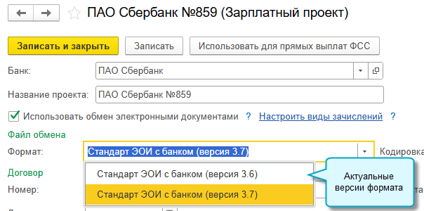 Теперь показываются только актуальные версии формата файла обмена с банками по зарплатным проектам. Неактуальные версии скрыты.
