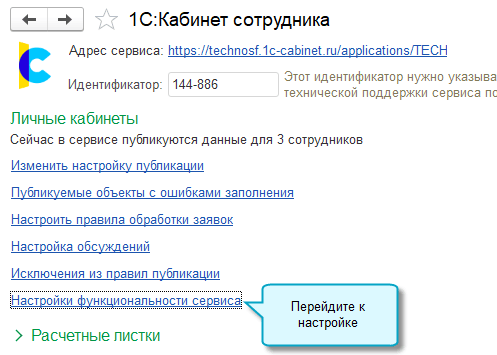 Теперь выполнить настройки функциональности сервиса 1С:Кабинет сотрудник можно не открывая сам сервис.