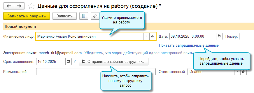 Добавлена возможность собирать данные от новых сотрудников для оформления на работу через сервис 1С:Кабинет сотрудника. Функционал доступен, если используется сервис 1С:Кабинет сотрудника версии 8.2.