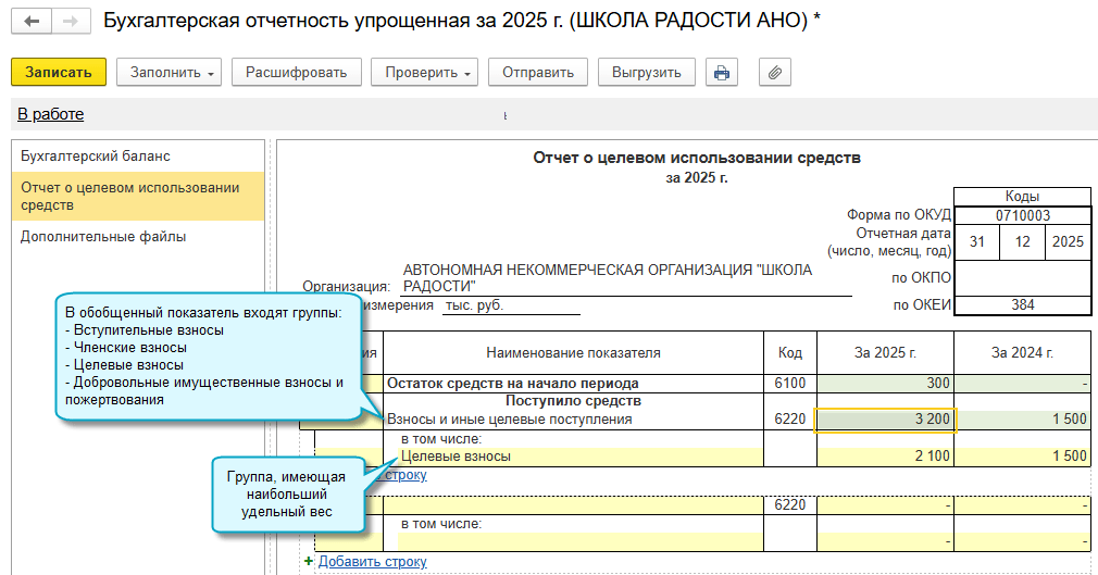 Добавлено автозаполнение упрощенного отчета об использовании целевых средств по форме, разработанной на основе образца, приведенного в ФСБУ 4/2023 "Бухгалтерская (финансовая) отчетность". Применяется форма начиная с отчетности за 2025 год.