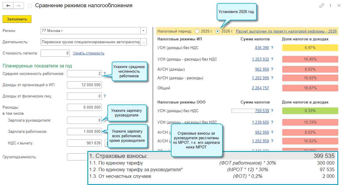 Поддержано доначисление базы для расчета страховых взносов за руководителя до уровня МРОТ по проекту налоговой реформы в обработке Сравнение режимов налогообложения. Для тех случаев, когда расчет производится для 2026 года и зарплата руководителя ниже МРОТ. Этот порядок применяется для общей и упрощенной системы налогообложения.