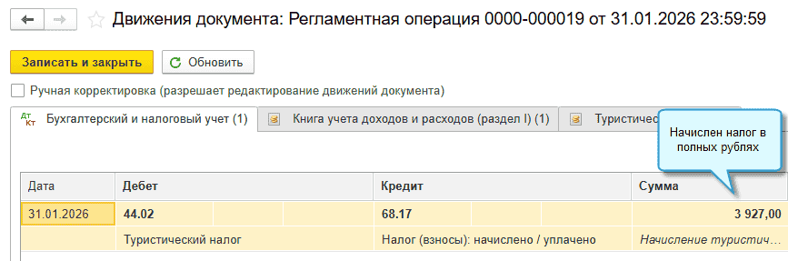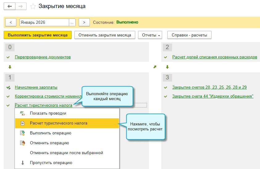 Полный интерфейс: меню "Операции - Закрытие периода - Закрытие месяца - Расчет туристического налога".