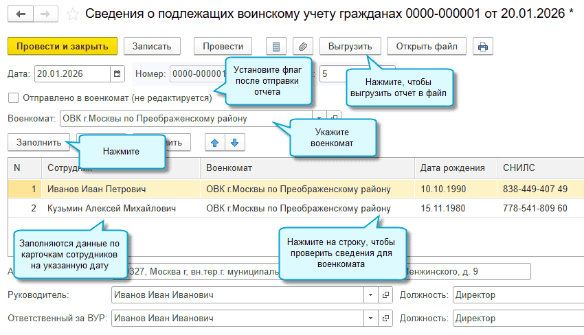 Для подготовки отчетов с выгрузкой добавлены документы в новом журнале Сведения для военкоматов: