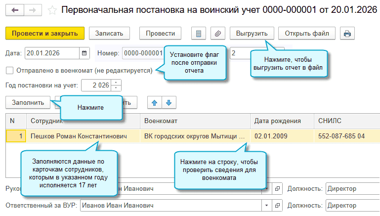 Настройте порядок ведения воинского учета.
