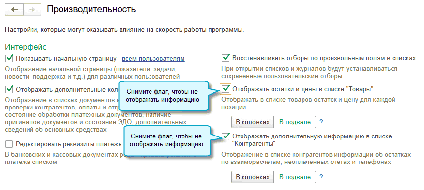 Теперь можно отказаться от вывода информации об остатках в списках Товары и Контрагенты в простом интерфейсе. Это пригодится, когда ведется учет нескольких организаций с большой номенклатурой или количеством контрагентов. Списки будут быстрее формироваться без остатков.