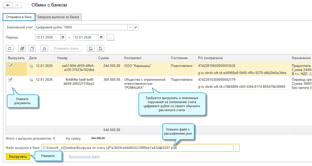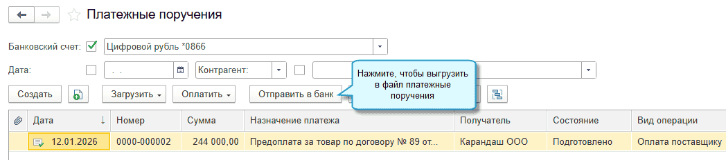 Добавлена возможность выгружать в банк данные для заполнения распоряжений по счету цифрового рубля. Для этого используется документ Платежное поручение. Доступны пока операции по оплате поставщику и по переводу между своими счетами.