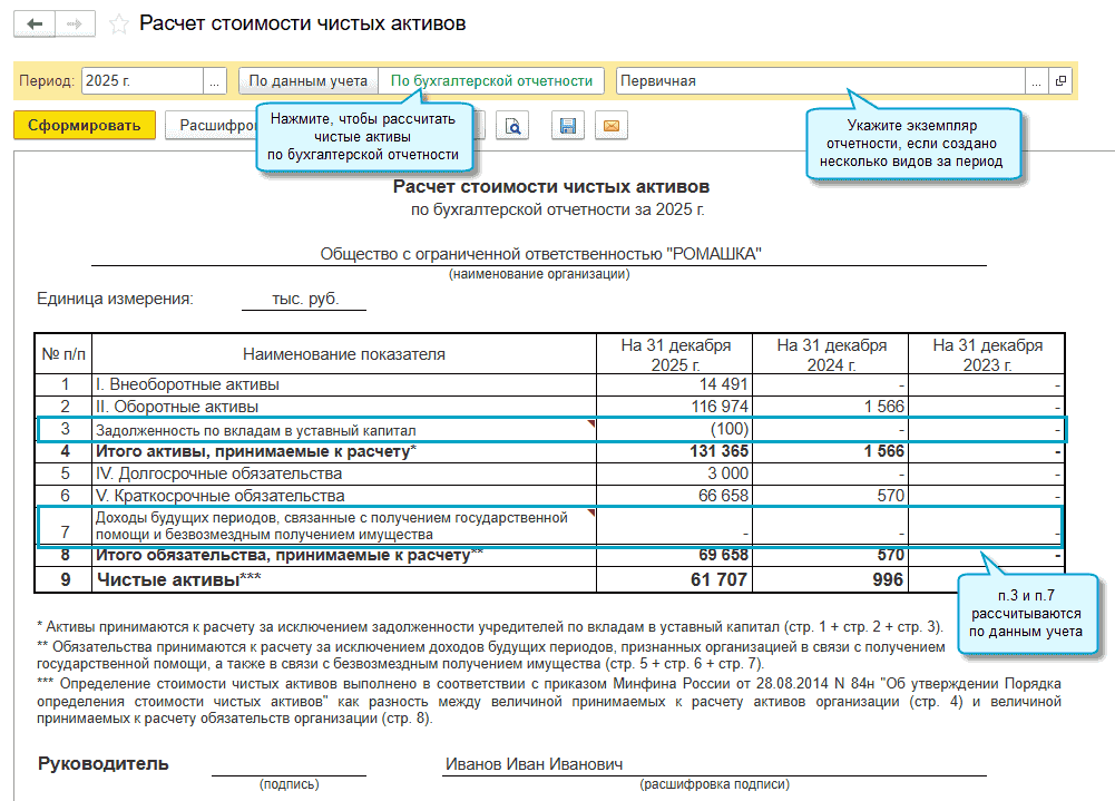 Добавлена возможность рассчитать стоимость чистых активов в соответствии с приказом Минфина России от 28.08.2014 № 84н в редакции от 31.03.2025.