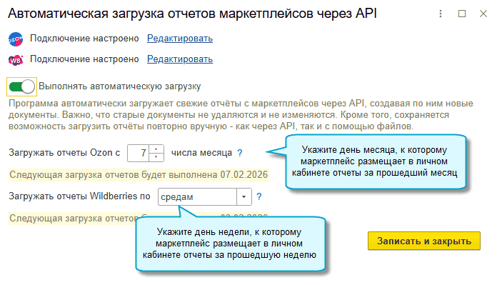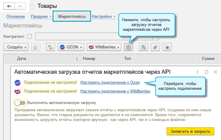 Добавлена возможность вести упрощенный учет продаж на OZON и Wildberries для тех, кому не требуется вести учет товаров и расчетов с контрагентами. При его использовании не нужно вводить документы по поступлению товаров от поставщиков и их отгрузке на маркетплейсы.