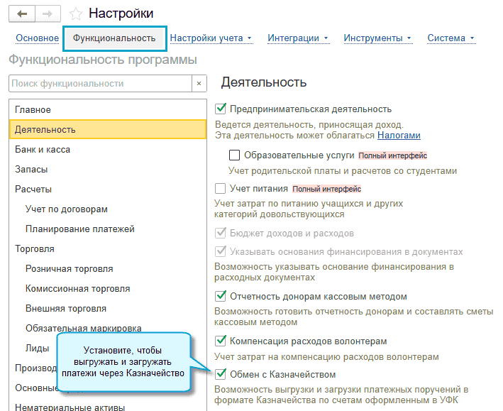 Полный интерфейс: меню "Администрирование - Настройки программы - Функциональность - Деятельность ".
