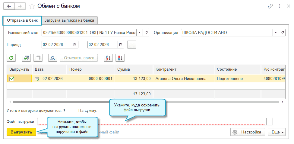 Добавлена возможность выгружать платежные поручения в файл, если подключен сервис 1С:ДиректБанк. Используйте такой способ в случаях, когда невозможно отправить платежные поручения в банк через сервис.