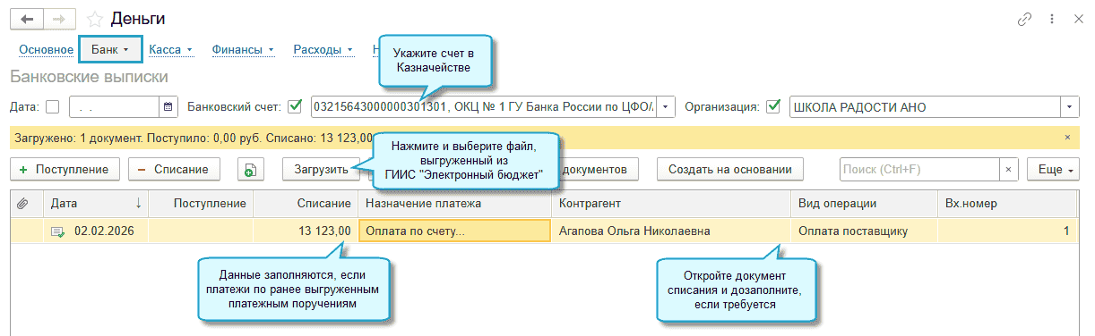 Платежные поручения выгружаются в файлы, который можно загрузить в ГИИС "Электронный бюджет", чтобы перечислить поставщику. Информация о платежах из ГИИС "Электронный бюджет" загружается как банковская выписка в журнале банковских выписок.