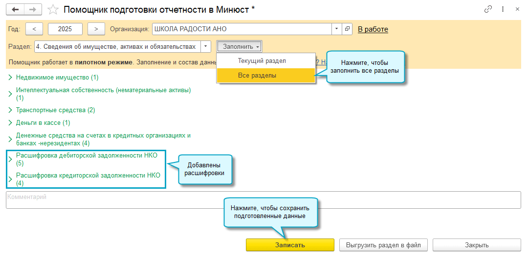 В помощнике подготовки отчетности в Минюст теперь можно заполнить сразу все разделы и записать данные, чтобы позже к ним вернуться, если потребуется.