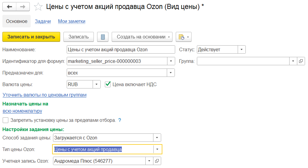 Идентификатор для формул заполняется автоматически в зависимости от выбранного типа цены.