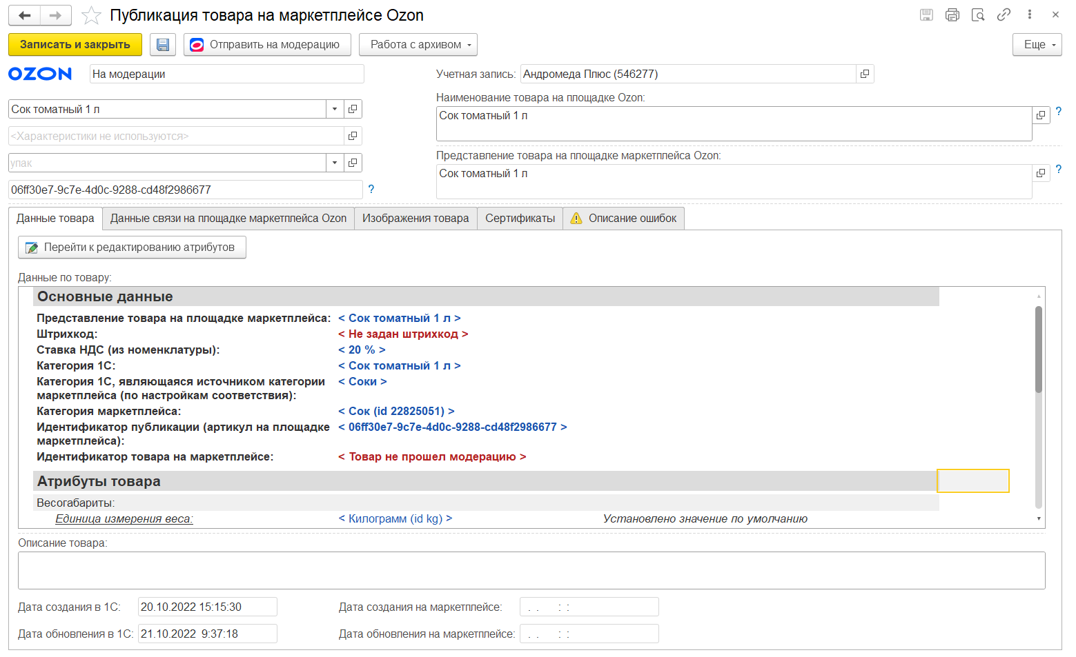 В созданной карточке товара на соответствующих закладках отображается текущее состояние заполнения атрибутов с подсказками об ошибках заполнения, а также некоторые данные связи с маркетплейсом (идентификатор товара на площадке маркетплейса Ozon, идентификаторы SKU, гиперссылка на товар на площадке маркетплейса). Также содержится информация об изображениях и сертификатах товара и информация об ошибке, если она была зафиксирована.