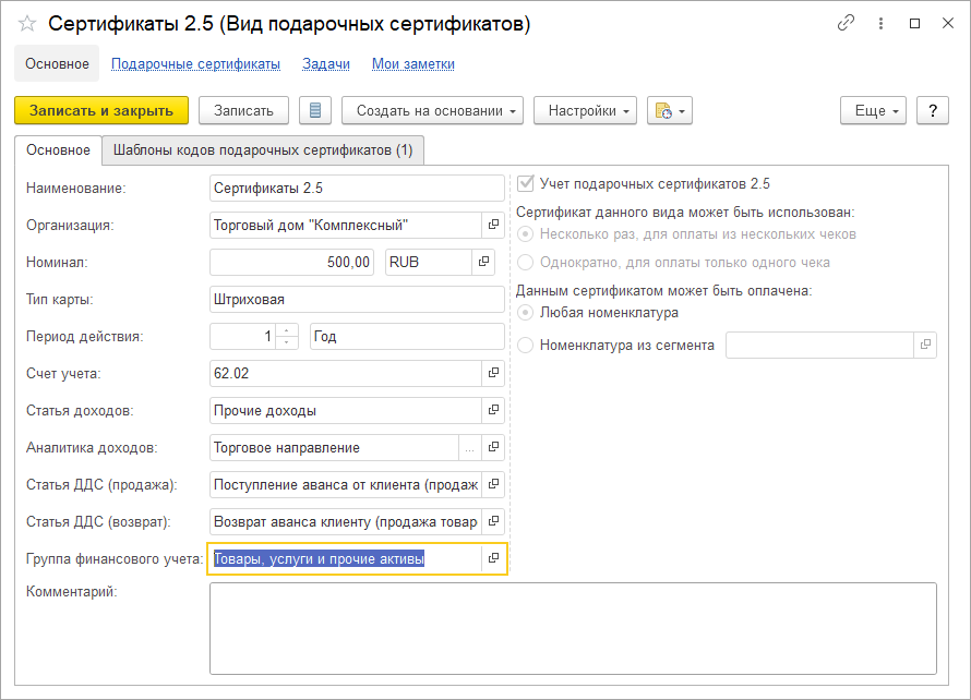 Для Вида подарочных сертификатов с установленным флагом Учет подарочных сертификатов 2.5 требуется дополнительно указать следующие реквизиты: