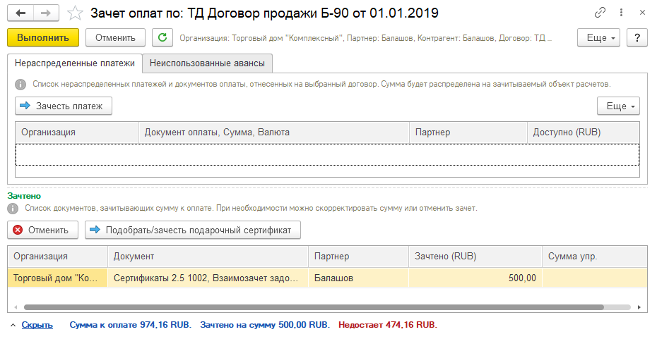 Оплата сертификатом производится по кнопке Зачет оплаты на закладке Основное в следующих документах: