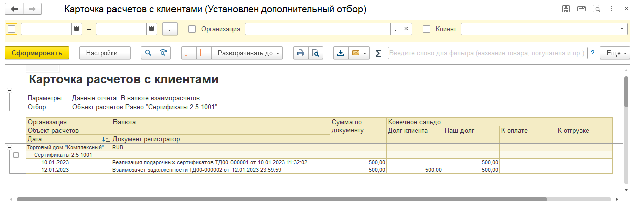 По команде Отчеты - Карточка расчетов с клиентами формируется соответствующий отчет, который позволяет провести анализ операций по сертификату.