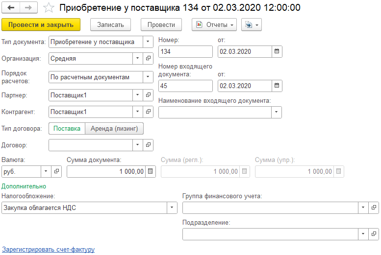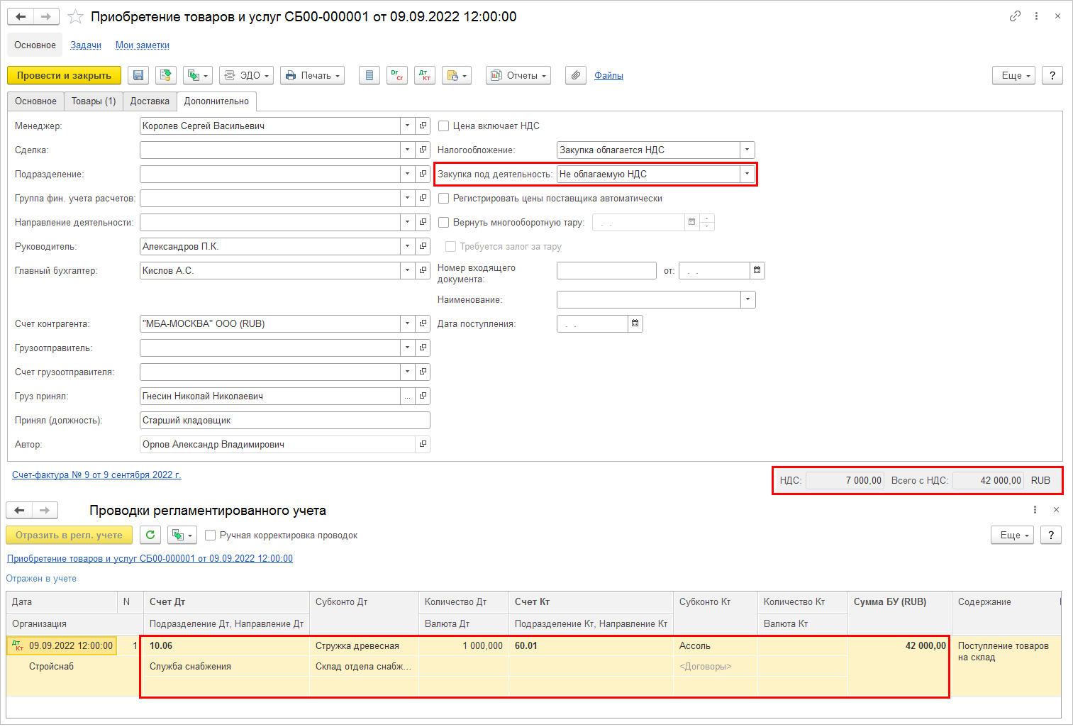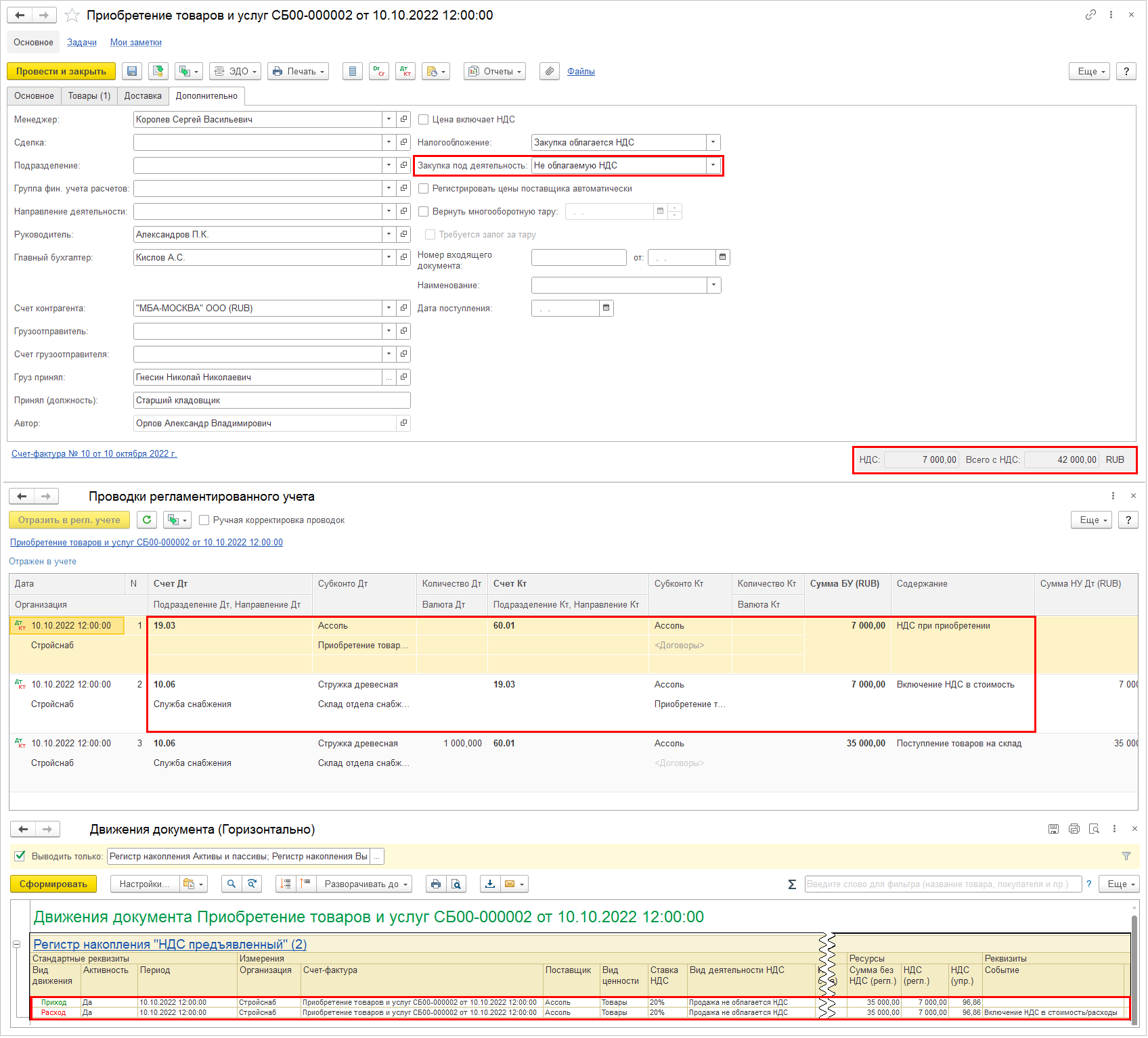 Если настройка При приобретении под необлагаемую деятельность проводить включение НДС в стоимость через 19 счет включена, тогда при оформлении документа приобретения товаров (работ, услуг) с указанием в нем вида деятельности Не облагаемую НДС формируются: