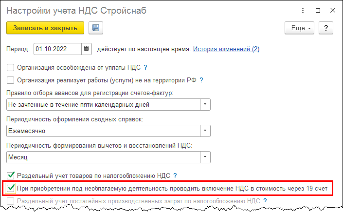 Если настройка При приобретении под необлагаемую деятельность проводить включение НДС в стоимость через 19 счет выключена, порядок учета входящего НДС соответствует применявшемуся до версии 2.5.11.