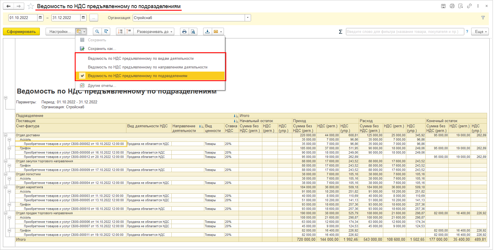 Отчет Ведомость по НДС предъявленному строится по данным регистра оперативного учета НДС предъявленный по выбранной организации за указанный период. В отчет выводятся данные о движении входящего НДС в разрезе видов и направлений деятельности, видов ценностей, ставок НДС с группировкой по поставщикам и документам приобретения. По кнопке Настройки доступен выбор варианта группировки данных отчета по видам деятельности, по направлениям деятельности или по подразделениям.