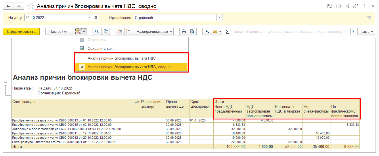 В отчете Анализ причин блокировки вычета НДС дополнительно выводится информация о суммах НДС, непринятых к вычету, по которым причины для блокировки вычета отсутствуют.