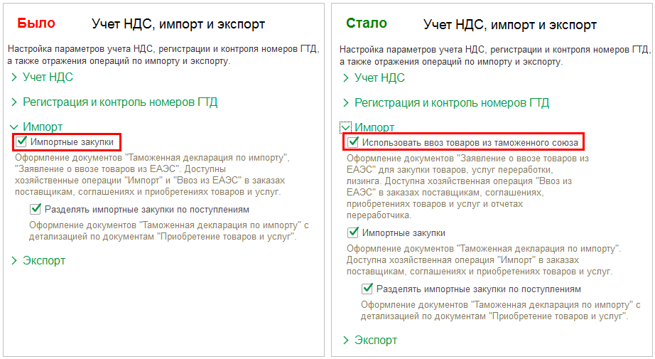 Ведение учета НДС при импорте из ЕАЭС теперь доступно, если включена новая функциональная опция Использовать ввоз товаров из таможенного союза (меню НСИ и администрирование – Настройка НСИ и разделов – Учет НДС, импорт и экспорт – Импорт).