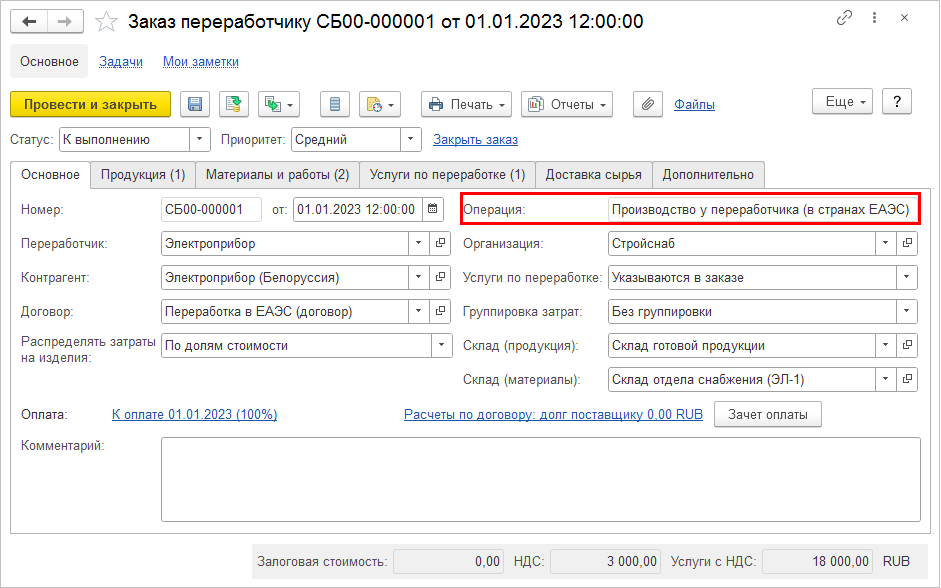 В документы Заказ переработчику версии 2.5 и Отчет переработчика версии 2.5 добавлена новая хозяйственная операция Производство у переработчика (в странах ЕАЭС). Данная хозяйственная операция подставляется в документ при выборе договора с типом Передача в переработку (в страны ЕАЭС).