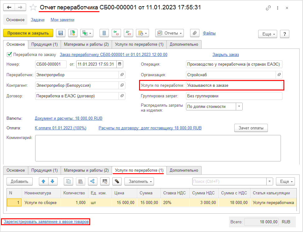 Если в документе Отчет переработчика версии 2.5 выбран вариант Услуги переработки = Указываются в заказе, тогда документ Заявление о ввозе товаров из ЕАЭС оформляется по данным такого отчета переработчика. В документ Отчет переработчика добавлена гиперссылка Зарегистрировать заявление о ввозе товаров.