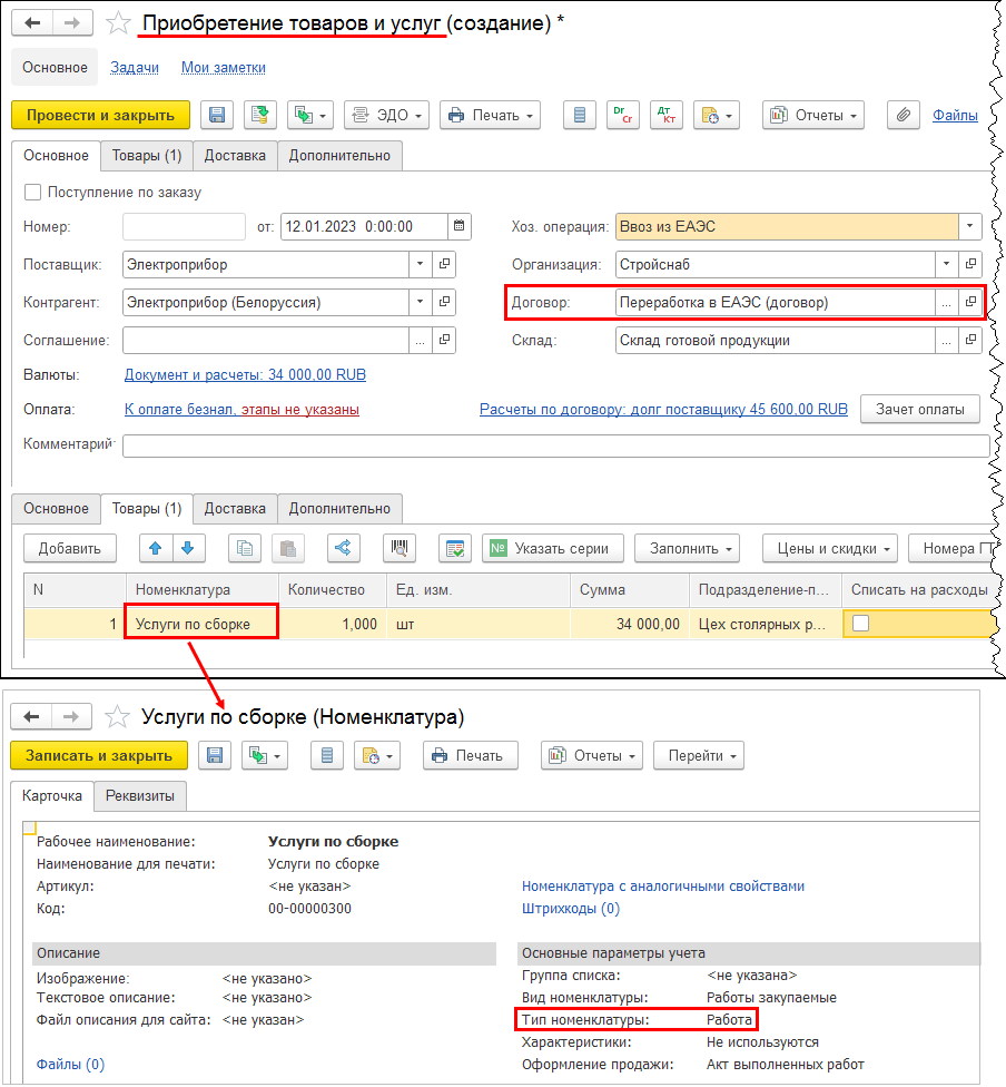 В документ Приобретение товаров и услуг с хозяйственной операцией Ввоз из ЕАЭС и в документ Приобретение услуг и прочих активов добавлена возможность выбора договоров с типом Передача в переработку (в страны ЕАЭС). При этом в табличной части документа Приобретение товаров и услуг может быть выбрана номенклатура только с типом Работа.