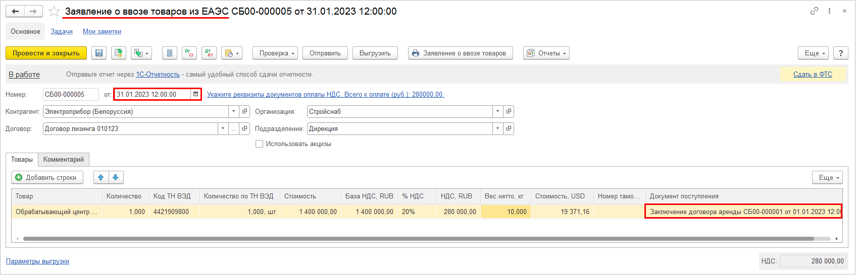 Записи в регистр накопления Товары к оформлению документов импорта документы по лизингу делают последним числом каждого месяца из графика оплат по договору. Поэтому в рабочем месте Заявления о ввозе товаров из ЕАЭС к оформлению оформление документов Заявление о ввозе товаров из ЕАЭС доступно с первого числа следующего месяца.