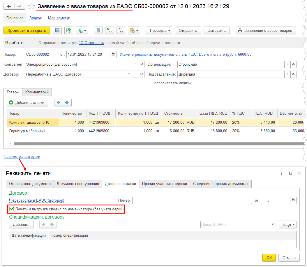 Поддержана возможность печати и выгрузки документов Заявление о ввозе товаров из ЕАЭС без детализации по характеристикам и сериям номенклатуры. Для этого на закладку Договор поставки формы Реквизиты печати, доступной из документа по гиперссылке Параметры выгрузки, добавлена настройка Печать и выгрузка сводно по номенклатуре (без учета серий).