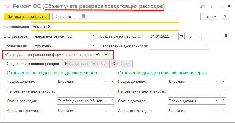 В карточку элемента списка Объекты учета резервов предстоящих расходов добавлен признак Допускается различное формирование резервов БУ и НУ.