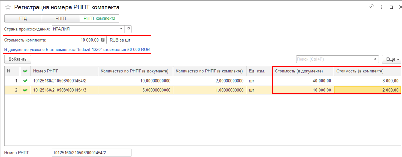 При создании нового элемента справочника Номера ГТД для типа номера ГТД РНПТ/РНПТ комплекта сведения о Номенклатуре, Наименовании товара, Стоимости заполняются вручную. При записи номера РНПТ комплекта выполняется проверка, при которой стоимость комплектующих не может превышать стоимость комплекта.