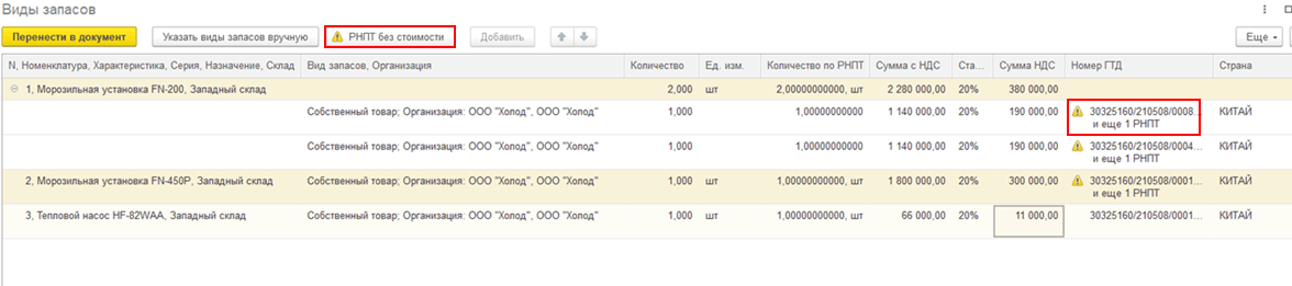 В форме Виды запасов (доступной по команде Еще – Открыть виды запасов на форме расходных накладных) предусмотрена команда РНПТ без стоимости, выполняющая отбор строк списка. При применении этой команды в списке отбираются строки, содержащие номера РНПТ комплектов, у которых не заполнены стоимостные показатели как в целом за комплект, так и в строках таблицы комплектующих.