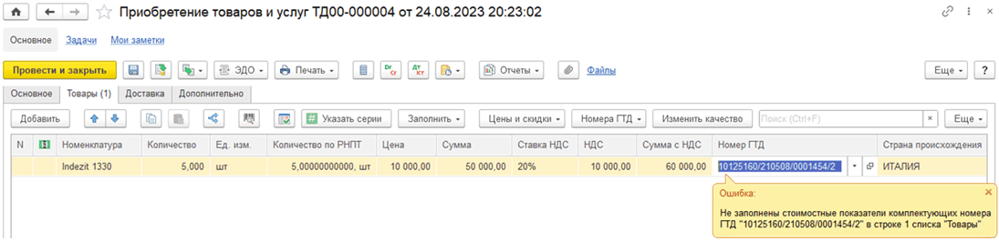 Если в строке приходной накладной указан номер ГТД, в карточке которого для РНПТ комплекта не заполнена стоимость комплектующих, то при проведении приходных накладных выходит сообщение типа: «Не заполнены стоимостные показатели комплектующих номера ГТД "10125160/210508/0001454/2" в строке 1 списка "Товары"».
