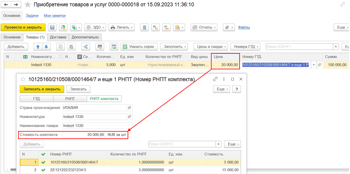 Создан составной прослеживаемый номер ГТД (РНПТ) для РНПТ комплекта, где количество и стоимость нормированы на 1 ед. комплекта.