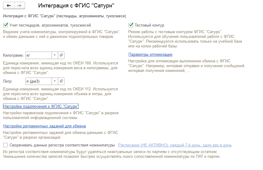 В разделе НСИ и администрирование – Интеграция с ФГИС Сатурн (пестициды, агрохимикаты, тукосмеси) задаются единицы измерения: Килограмм и Литр, задаются настройки подключения, возможность работы в тестовом контуре, а также следующие регламентные задания: