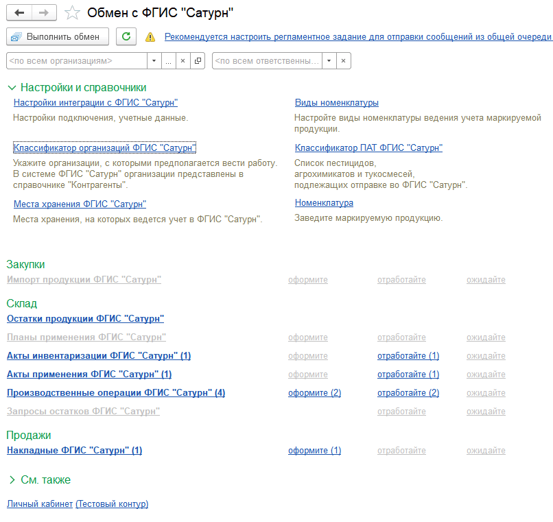После включения опции становится доступно рабочее место Обмен с ФГИС "Сатурн" в разделах Продажи, Закупки, Склад и доставка, Производство.