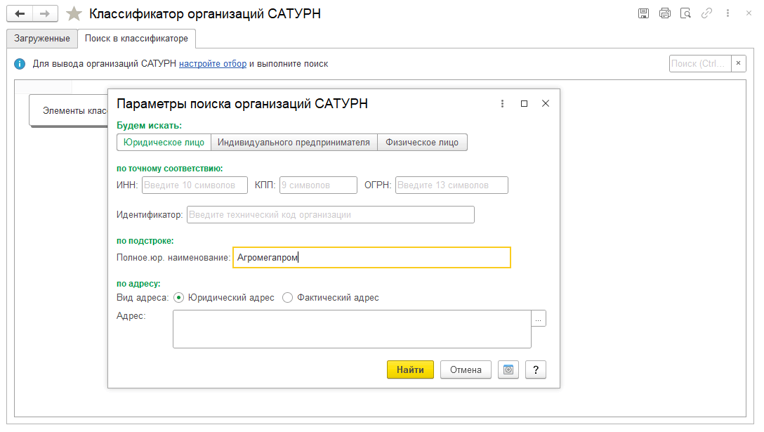 При загрузке данных из ФГИС "Сатурн" необходимо в соответствующем списке на закладке Поиск в классификаторе заполнить параметры поиска. Так в классификаторе организаций можно выполнить поиск по следующим значениям: