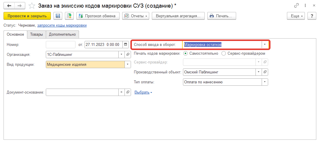 В документе Заказ на эмиссию кодов маркировки СУЗ с операцией Перемаркировка для участника оборота, не являющегося владельцем кода GTIN, реализована возможность указать код GTIN и его владельца (в ГИС МТ передается ИНН владельца) и получить коды для перемаркировки товаров. Такая возможность предусмотрена для товарных групп Товары легкой промышленности и одежда и Обувная продукция. При указании владельца GTIN - запрещено самостоятельное указание серийных номеров, доступно только автоматическое формирование.