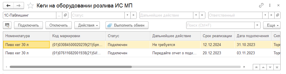 Если в момент отражения подключения кега к оборудованию для розлива сведения не были переданы в ГИС МТ, то в графе Дальнейшее действия отображается рекомендация Передайте отчет о подключении. Передать отчет может любой сотрудник, имеющий сертификат электронной подписи для передачи данных в ГИС МТ, по кнопке Выполнить обмен. После передачи данных в графе Дальнейшее действия отображается значение Не требуется.