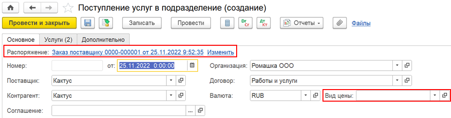 Распоряжением на оформление документа Поступление услуг в подразделение может быть документ Заказ поставщику или договор с поставщиком. В договоре с поставщиком определяется, что будет выступать распоряжением на оформление поступления (настройка Оформление поступления и ордера доступно).