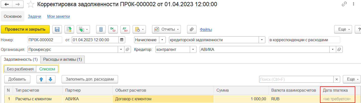 При начислении дебиторской задолженности поставщику и начислении кредиторской задолженности клиенту дата платежа недоступна. В этом случае в табличной части для поля Дата платежа будет использоваться условное оформление «не требуется».