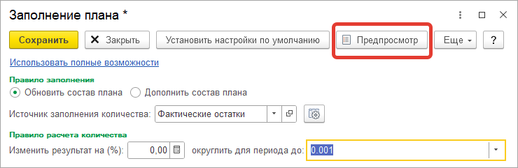 При настройке заполнения плана по источнику данных планирования добавлена команда “Предпросмотр”, по которой можно предварительно увидеть результат заполнения по источнику. Это может быть полезно для оценки корректности настройки.