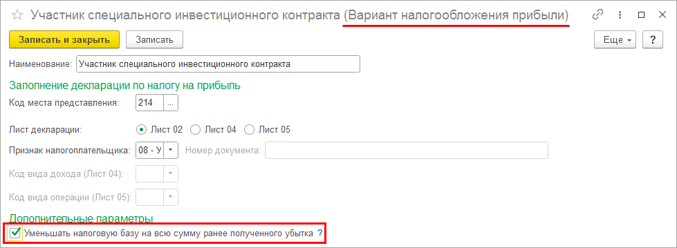 Например, у организации настроены 2 варианта налогообложения прибыли «Общие условия налогообложения» и «Участник специального инвестиционного контракта». В карточке варианта «Общие условия налогообложения» признак Уменьшать налоговую базу на всю сумму ранее полученного убытка не установлен, в карточке варианта «Участник специального инвестиционного контракта» - установлен. На начало 2023 года сумма перенесенного на будущее убытка за 2022 год по каждому варианту налогообложения составляет 300 000 руб. Прибыль за январь 2023 года по каждому варианту налогообложения составляет 400 000 руб. При выполнении регламентной операции Списание убытков прошлых лет в рамках процедуры Закрытие месяца налоговая база по варианту налогообложения «Общие условия налогообложения» будет уменьшена на 50% прибыли, т.е. на 400 000 х 0,5 = 200 000 руб. По варианту налогообложения «Участник специального инвестиционного контракта» - без учета ограничении 50% налоговой базы, т.е. на всю сумму убытка 300 000 руб.