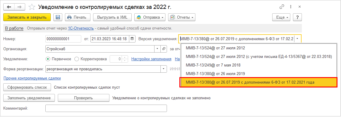 В документе Уведомление о контролируемых сделках доступна к выбору версия ММВ-7-13/380@ от 26.07.2019 с дополнениями 6-ФЗ от 17.02.2021 года.