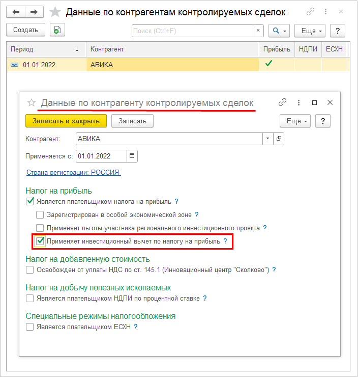 При формировании уведомления о контролируемых сделках за период с 2022г. по 2024г. не учитывается настройка Применяется инвестиционный вычет по налогу на прибыль из данных по контрагенту контролируемых сделок.