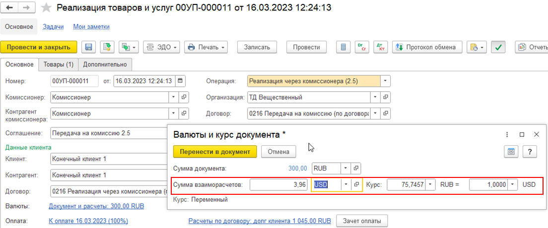 В договоре с клиентом с целью Реализация через комиссионера можно выбрать валюту взаиморасчетов, отличную от валюты взаиморасчетов, указанной в договоре с комиссионером с целью Передача на комиссию. Валюта расчетов в договоре с клиентом может отличаться от валюты расчетов в договоре с комиссионером.