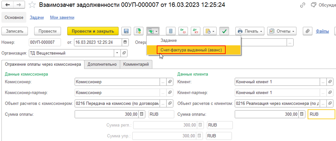 Поступление аванса от конечного клиента комиссионеру отражается документом Взаимозачет задолженности с операцией Отражение оплаты через комиссионера.