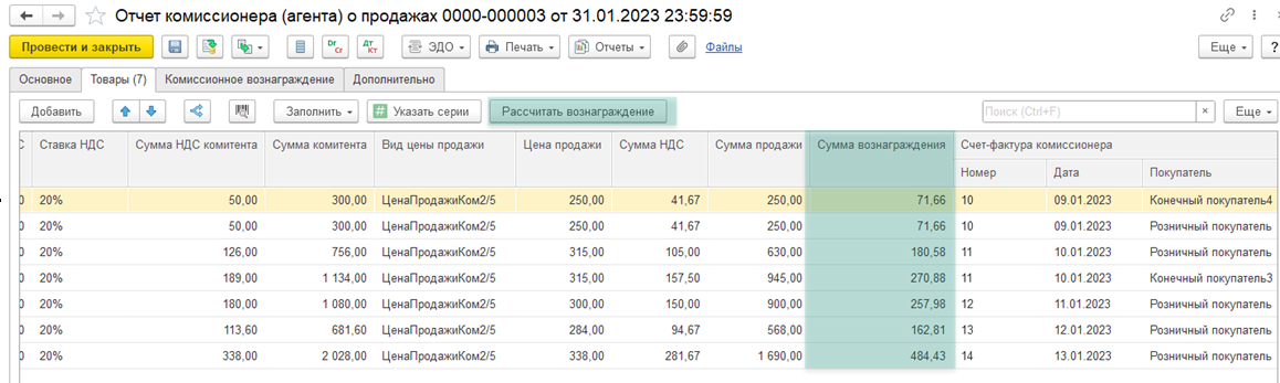 При применении команды Рассчитать вознаграждение в отчетах при таком способе расчета сумма вознаграждения распределяется пропорционально сумме продаж каждой строки (для отчета о закупках – пропорционально сумме закупок).